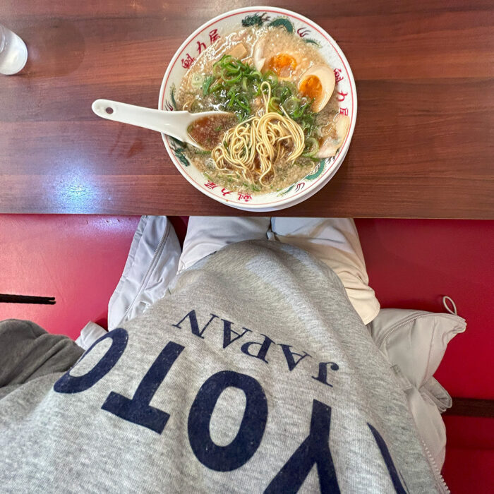 KYOTO JAPAN のスウェットできてしまったのでそのまま食べることになった。正面のその文字はいいとして、背中にでっかい福助のロゴがあるのが恥ずかしすぎて入口入ってすぐの背もたがいちばん大きい席を選んだ。恥ずかしくておいしさが5%半減した。