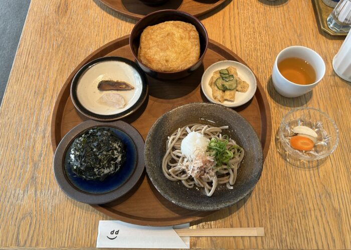 上から 時計回りに 油揚げと野菜の煮物 お麩の辛し和え おろしそば もみわかめのおむすび 梅干し 小鯛ささ漬 へしこ